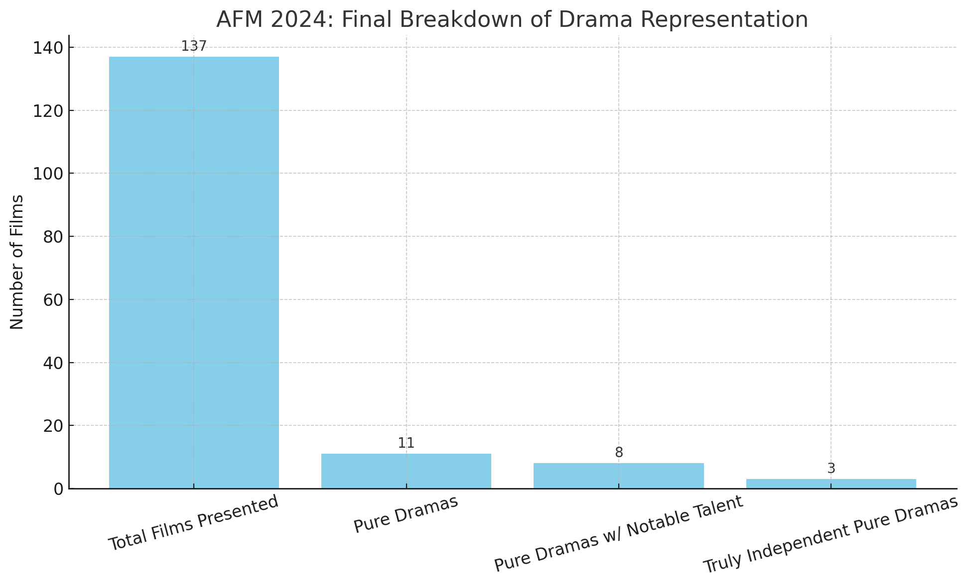 Look at the most recent American Film Market (AFM). Out of 137 films presented by international sales agents, only 11 were pure dramas, meaning films that are character-driven, grounded in reality, and not propped up by genre elements like horror, thriller, or romance, etc.